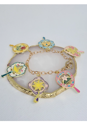 Handmade, high quality stainless steel chain bracelet, with shiny gold-plated coating. Six fan pendants attached, each representing a different Disney princess.